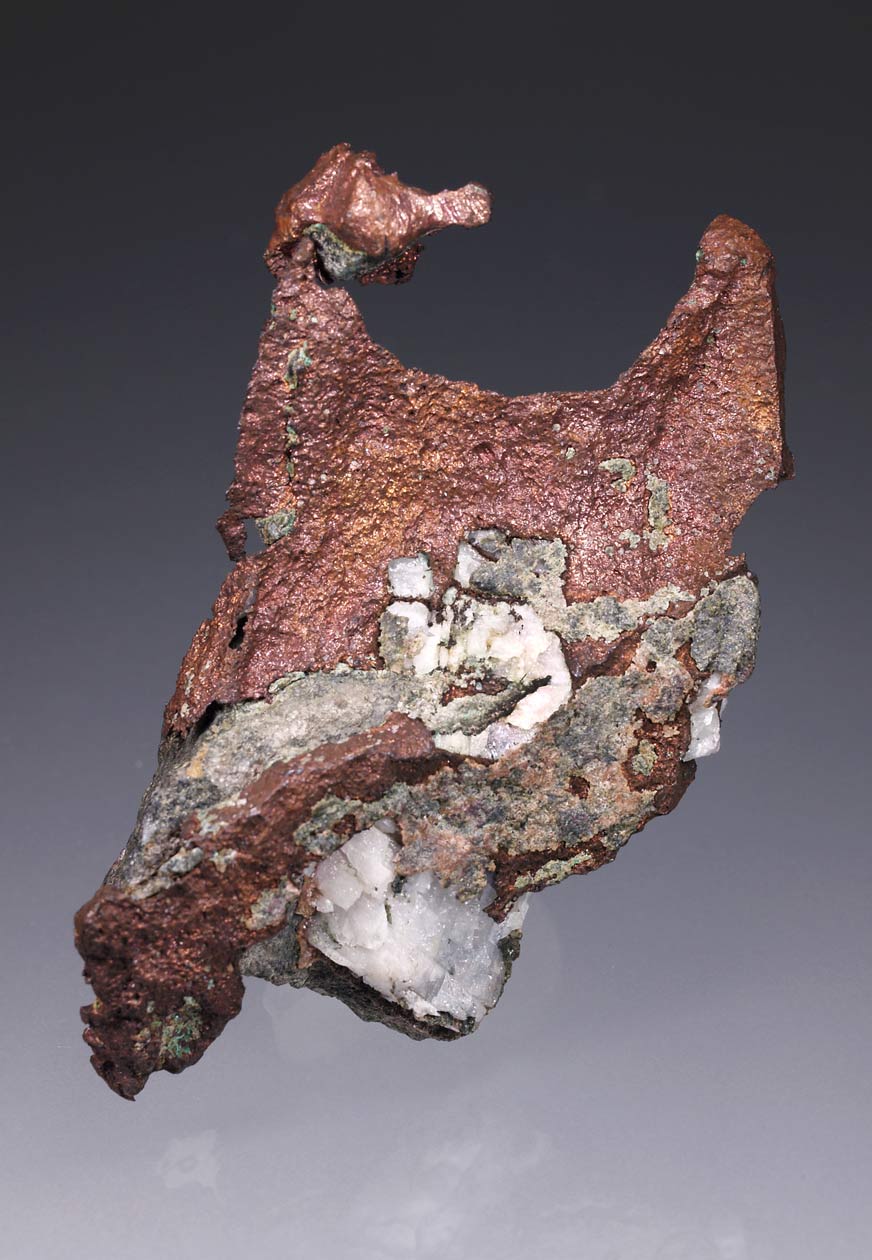 Ejemplar de cobre nativo de buen tamaño, que muestra caras redondeadas, típico de estos ejemplares, brillo y estética. Este ejemplar procede de los hallazgos realizados a mediados de los 90 en esta mina. No ha sido tratada con productos químicos, por lo que su color y brillo son naturales. De la colección Vilaseca, de Barcelona.