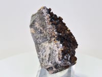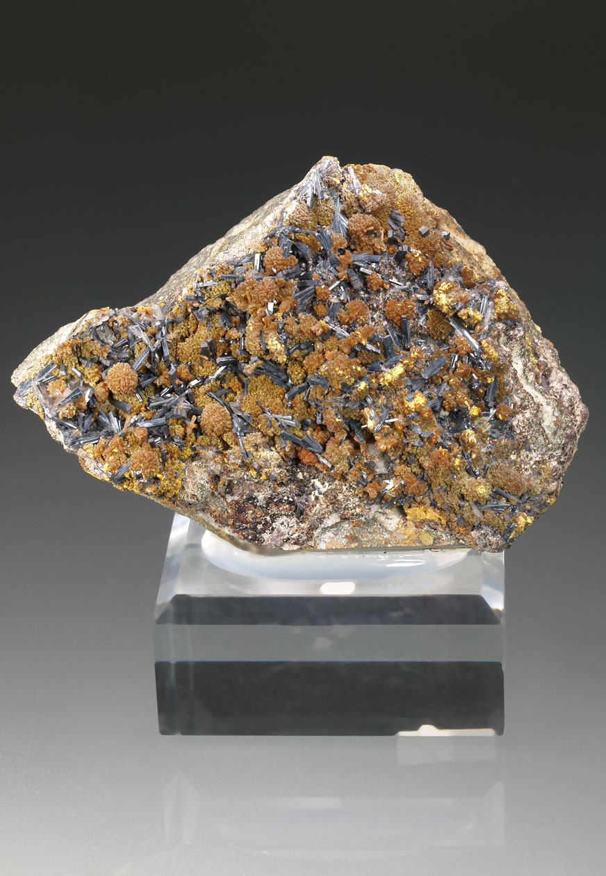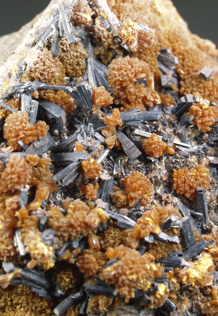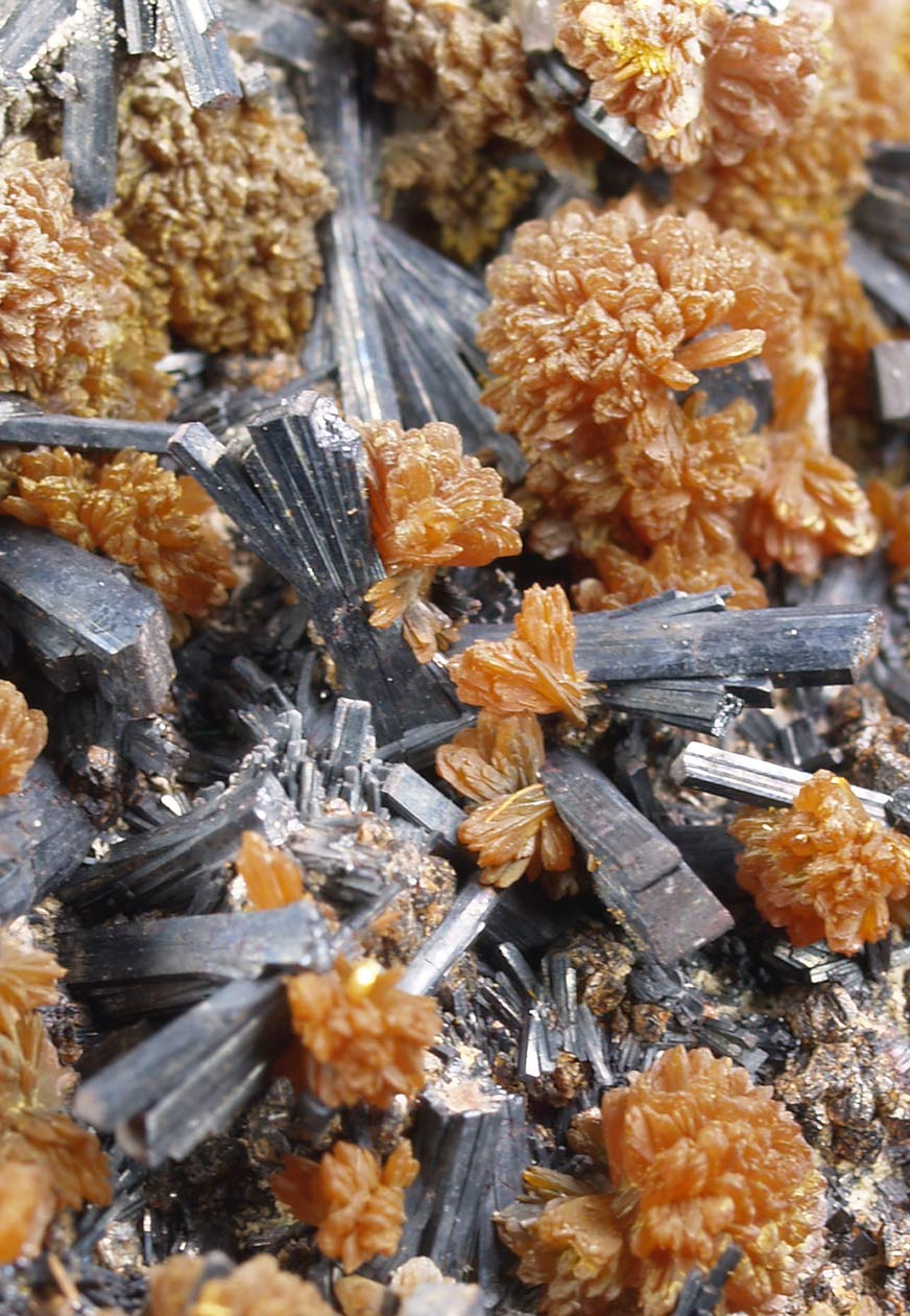 Muy estético ejemplar que nos muestra dos generaciones de orpimente. Una de intenso color anaranjado, formada por numerosos cristales, brillantes. Una segunda con cristales que tapizan la matriz de arsenopirita con pirita, con un tono más oscuro. Una pieza distinta de esta clásica mina Peruana.