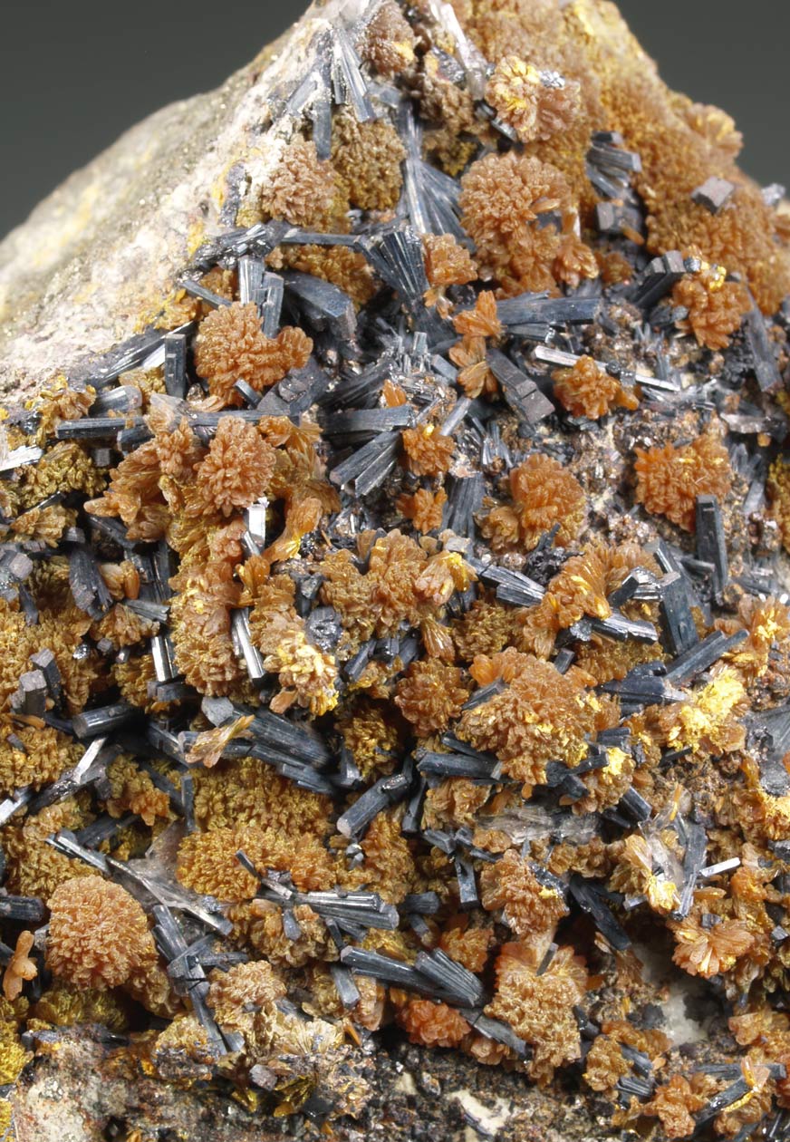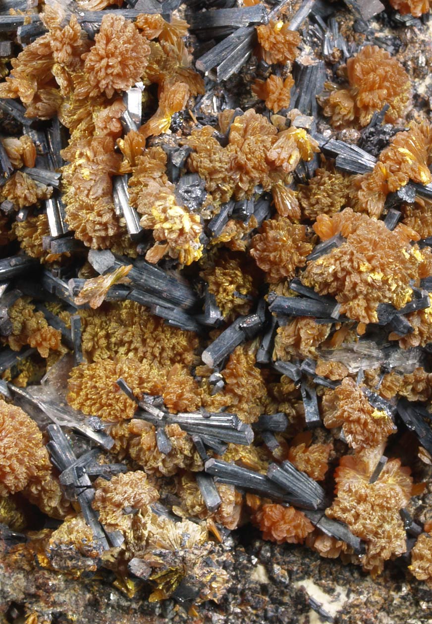 Sobre una matriz de sulfuros polimetálicos, parcialmente recubiertos por estéticos agregados de cristales anaranjados de rejalgar, se disponen numerosos agregados de cristales de hutchinsonita, una interesante sulfosal con talio, formando gavillas. Ya no se ven muchos de estos ejemplares en el mercado. La matriz está serrada por la parte posterior.
