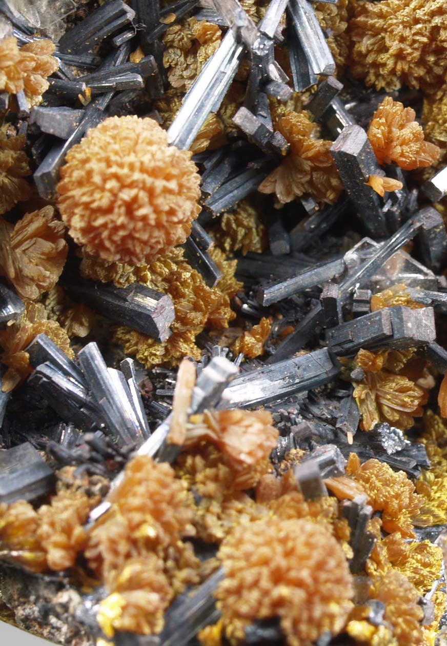 Brillante ejemplar formado por agregados globulares de cristales de oropimente, de color amarillo anaranjado con buen color. Se acompaña de brillantes cristales aciculares de rejalgar de intenso color rojo, transparentes y definidos. Se acompaña de cristales de barita, pirita y pirrotina. Un ejemplar distinto y de calidad para esta localidad clásica peruana.
